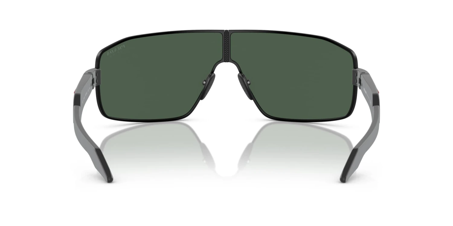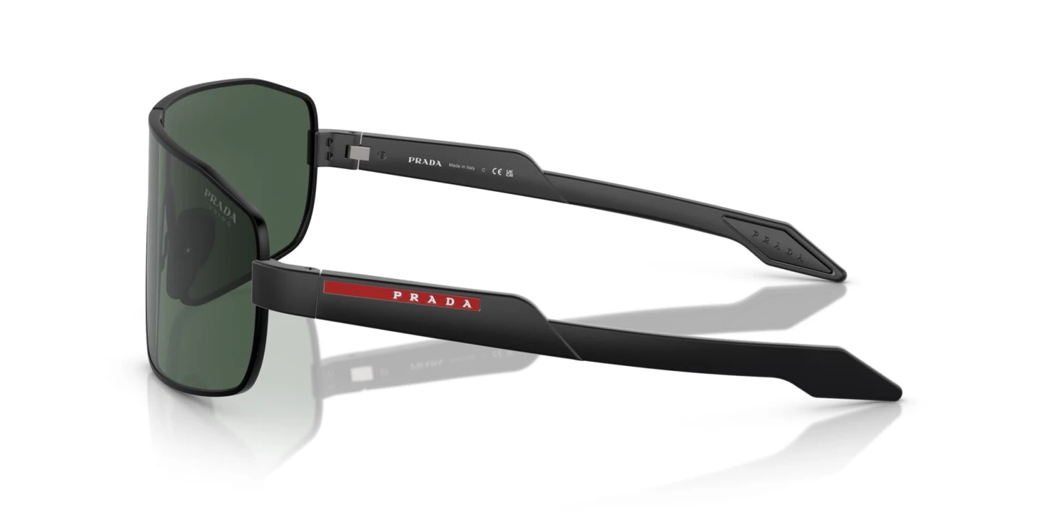 This rectangular Prada Linea Rossa sunglass comes in a matte black frame with dark green lenses.