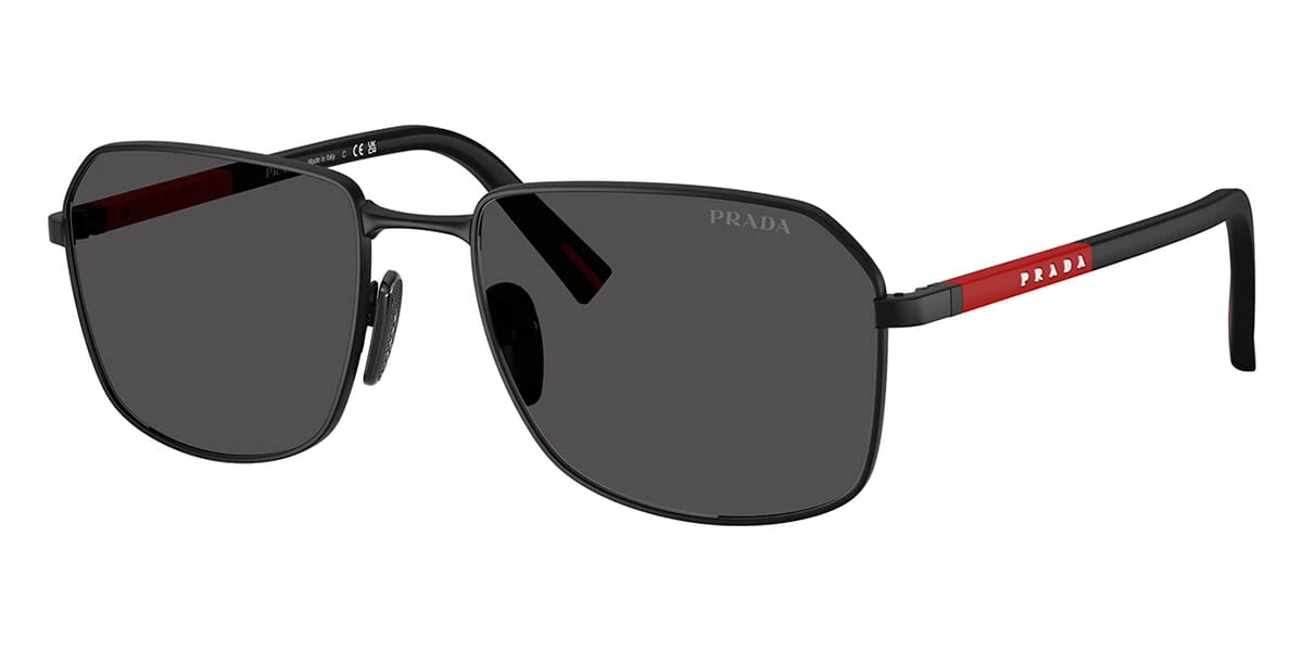 This rectangular Prada Linea Rossa sunglass comes in a matte black frame with dark grey lenses.