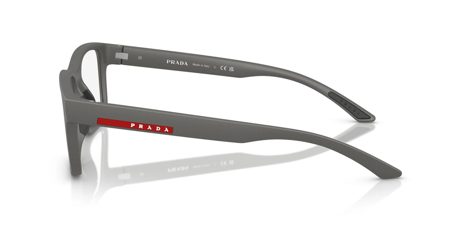 This rectangular Prada Linea Rossa optical comes in a metallized grey frame.
