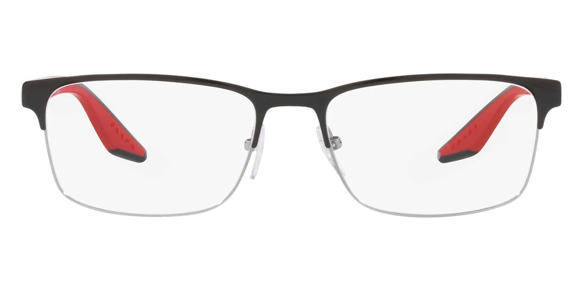 This rectangular Prada Linea Rossa optical comes in a black and silver frame.