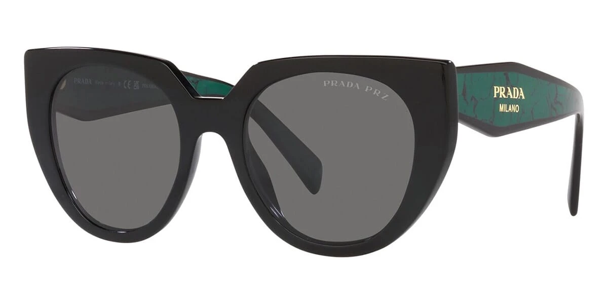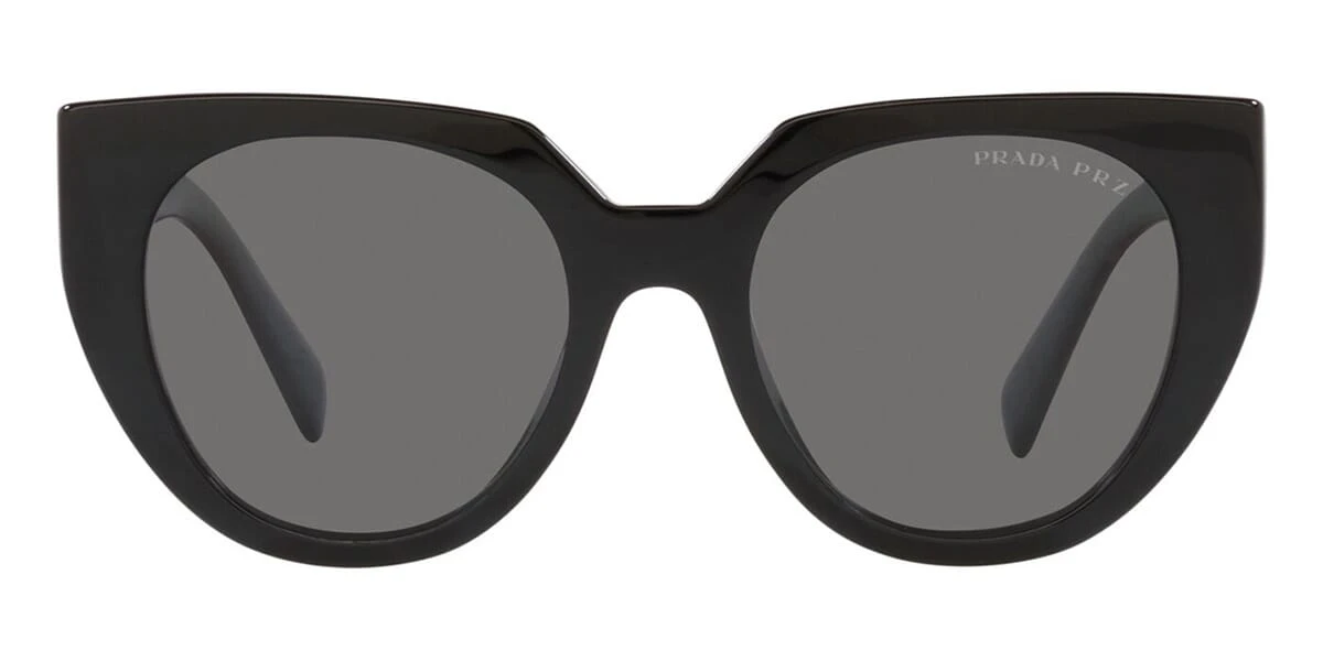 This cat eye Prada sunglass comes in a black frame with dark grey polarised lenses.