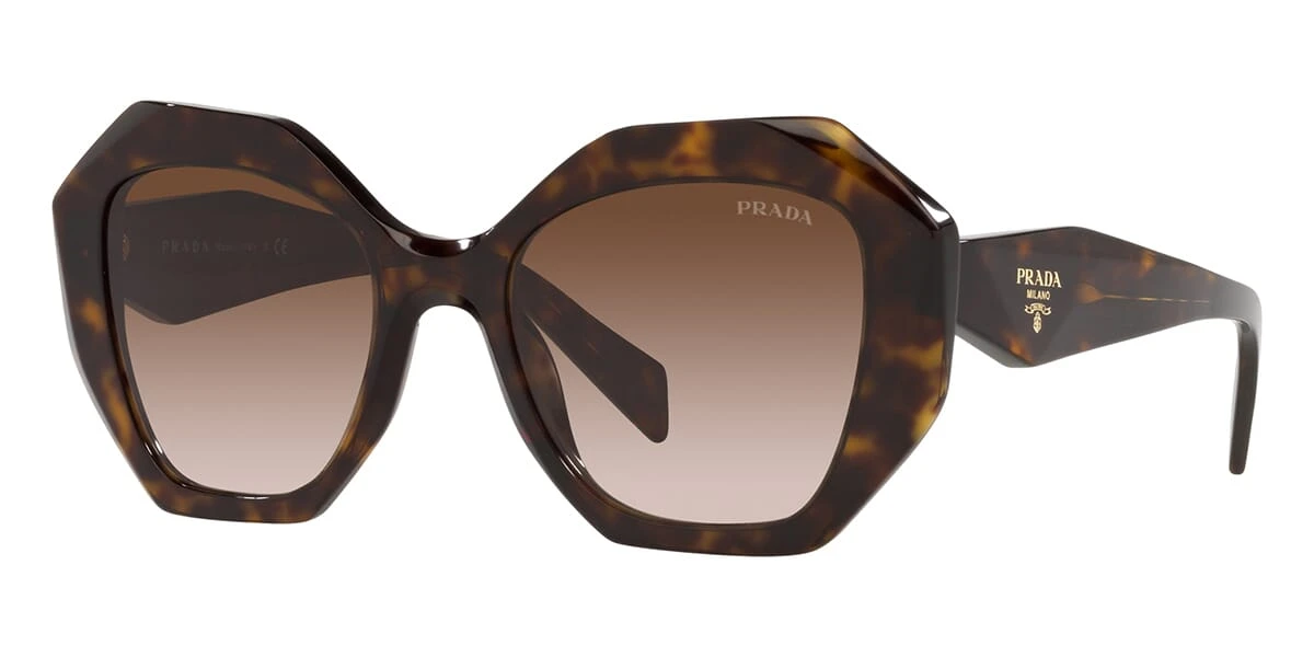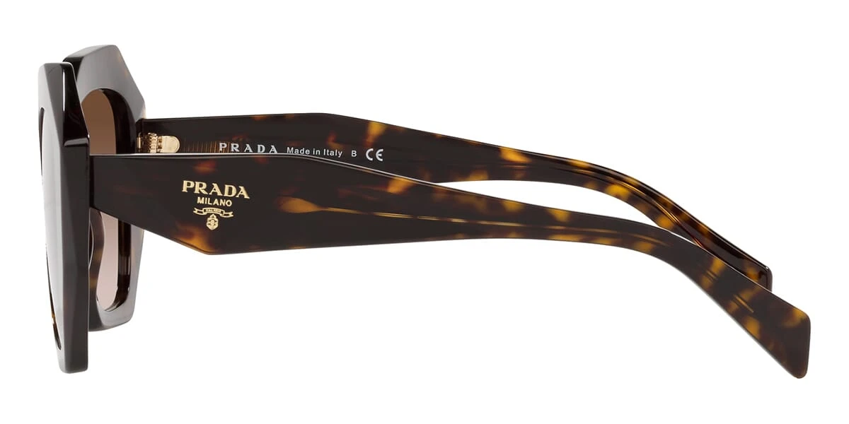 This rectangular Prada sunglass comes in a tortoise frame with brown gradient lenses.