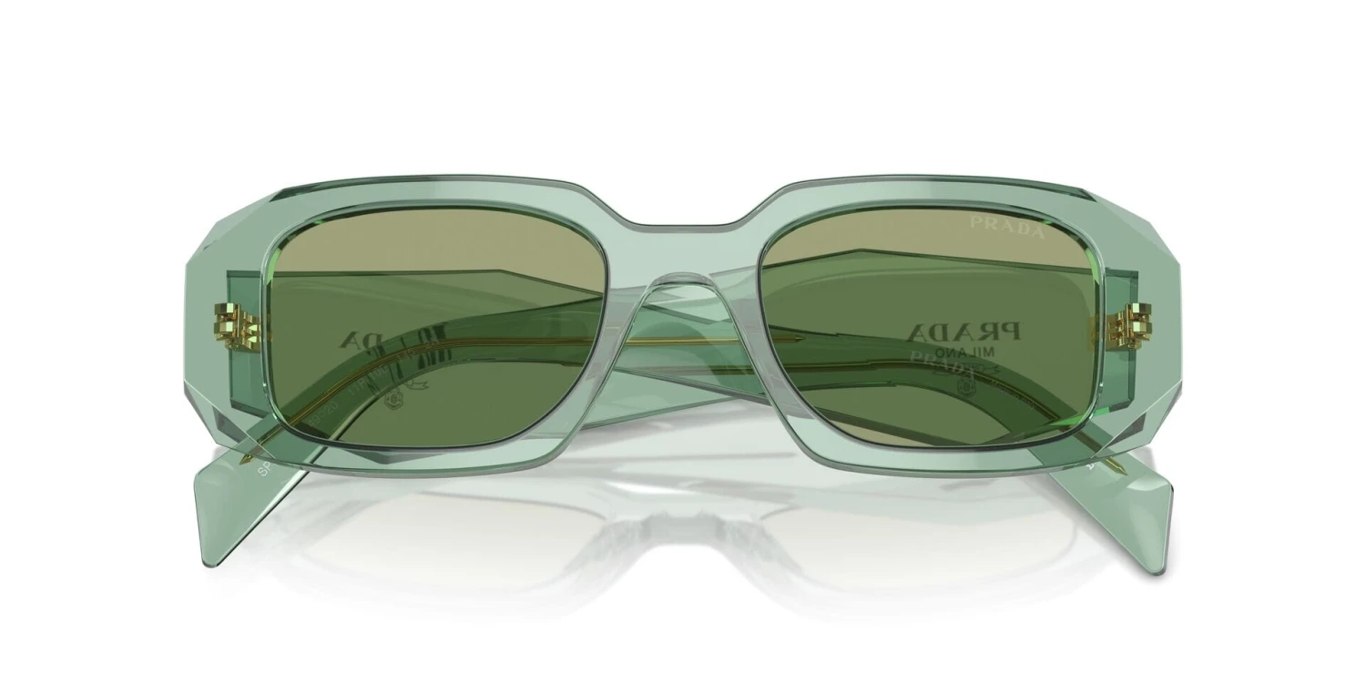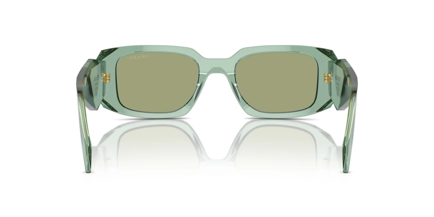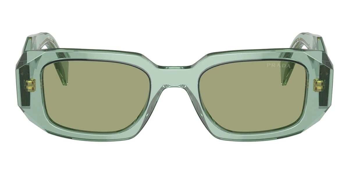 This rectangular Prada sunglass comes in a sage crystal frame with green with silver internal mirror lenses.