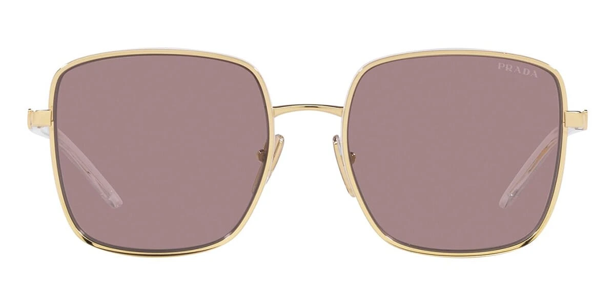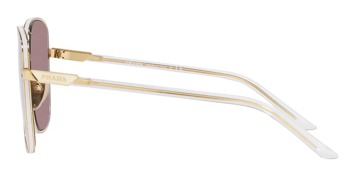 This square Prada sunglass comes in a pale gold frame with light purple with brown lenses.