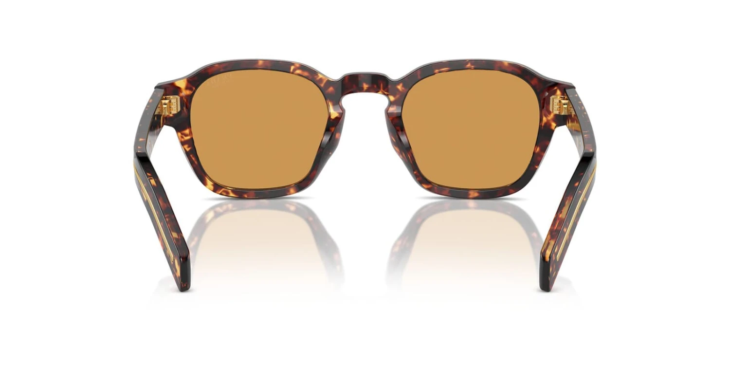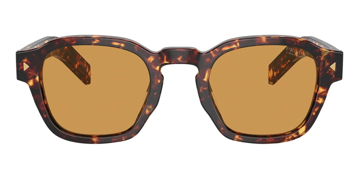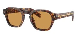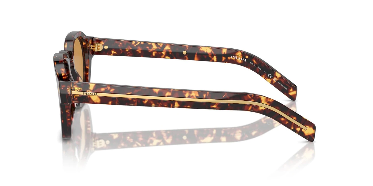 This round Prada sunglass comes in a magma tortoise frame with light brown to dark brown photochromic lenses.