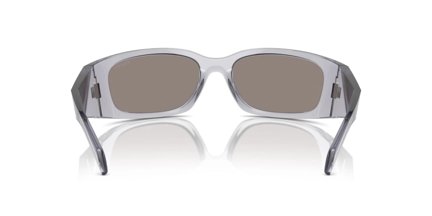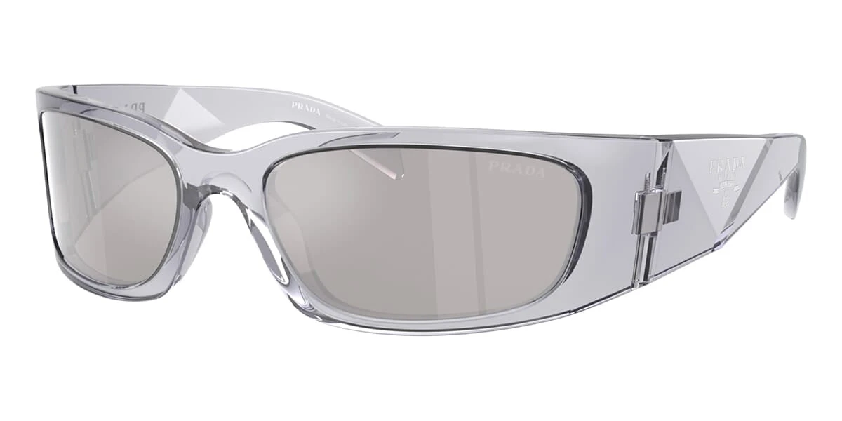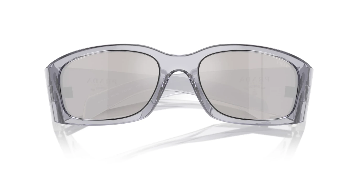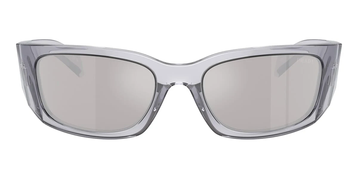 This rectangular Prada sunglass comes in a grey crystal frame with light grey with silver mirror lenses.