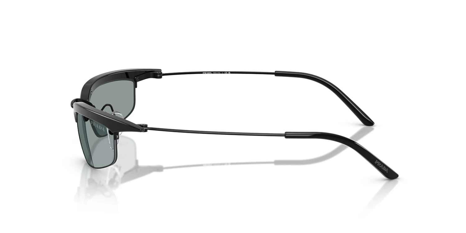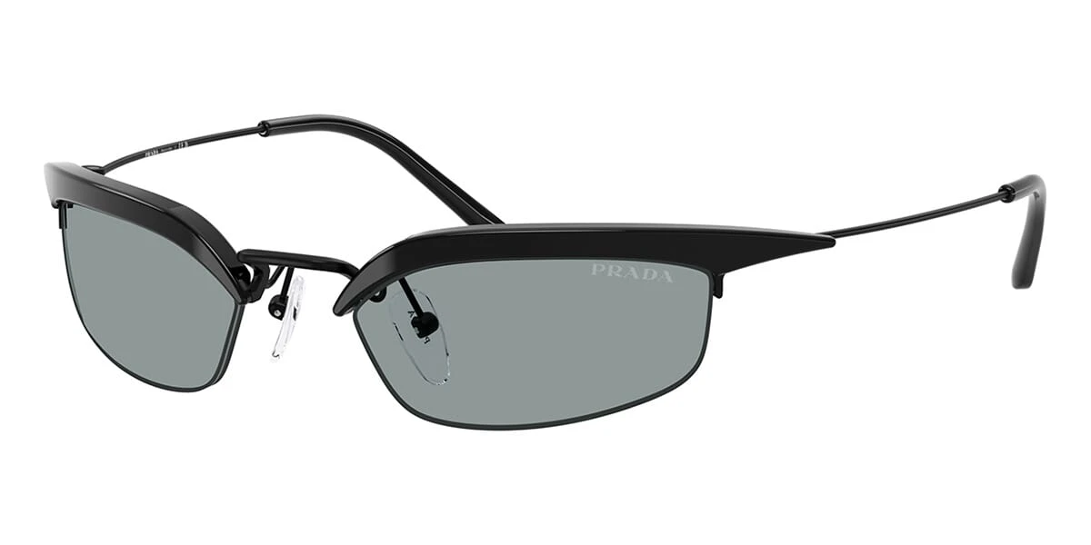 This rectangular Prada sunglass comes in a black frame with dark grey lenses.