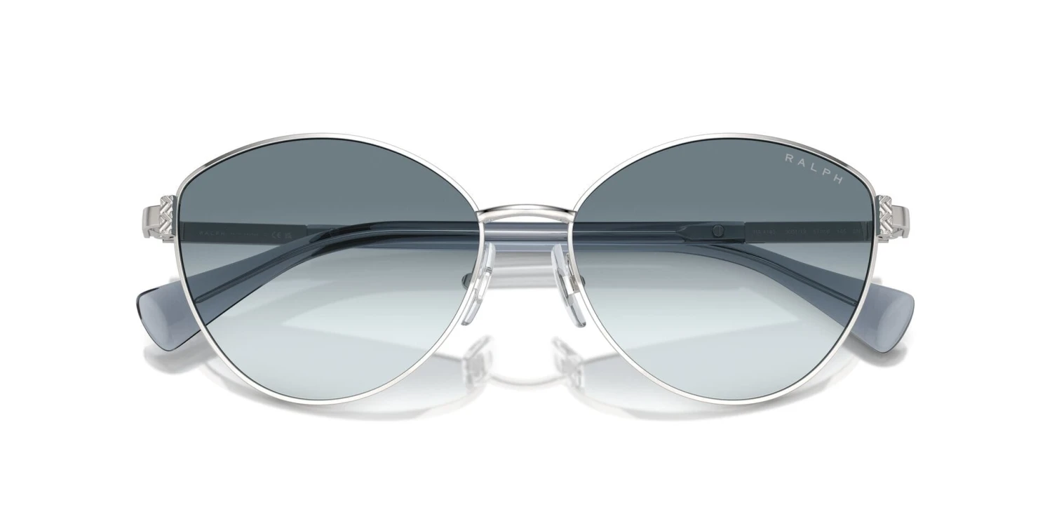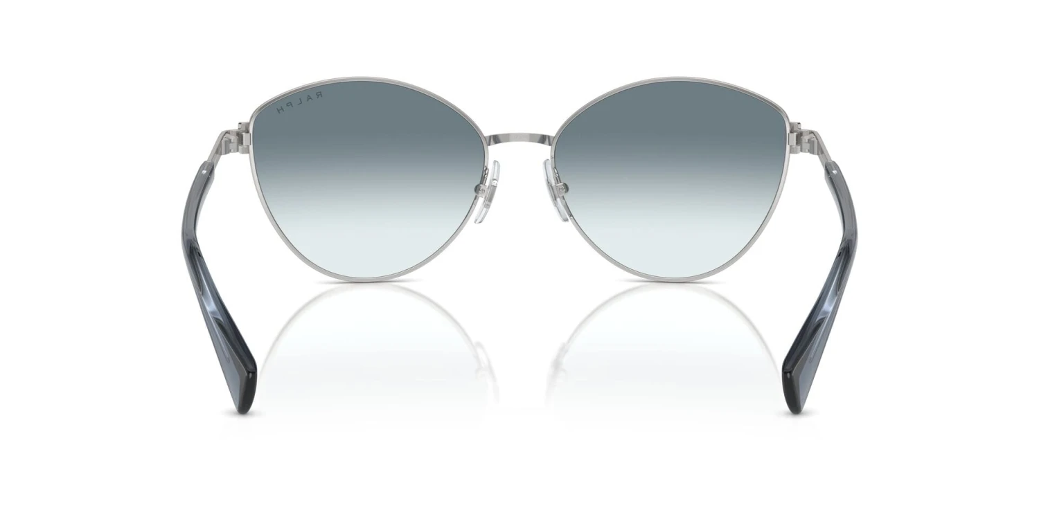 This cat eye Ralph by Ralph Lauren sunglass comes in a shiny silver frame with blue gradient lenses.