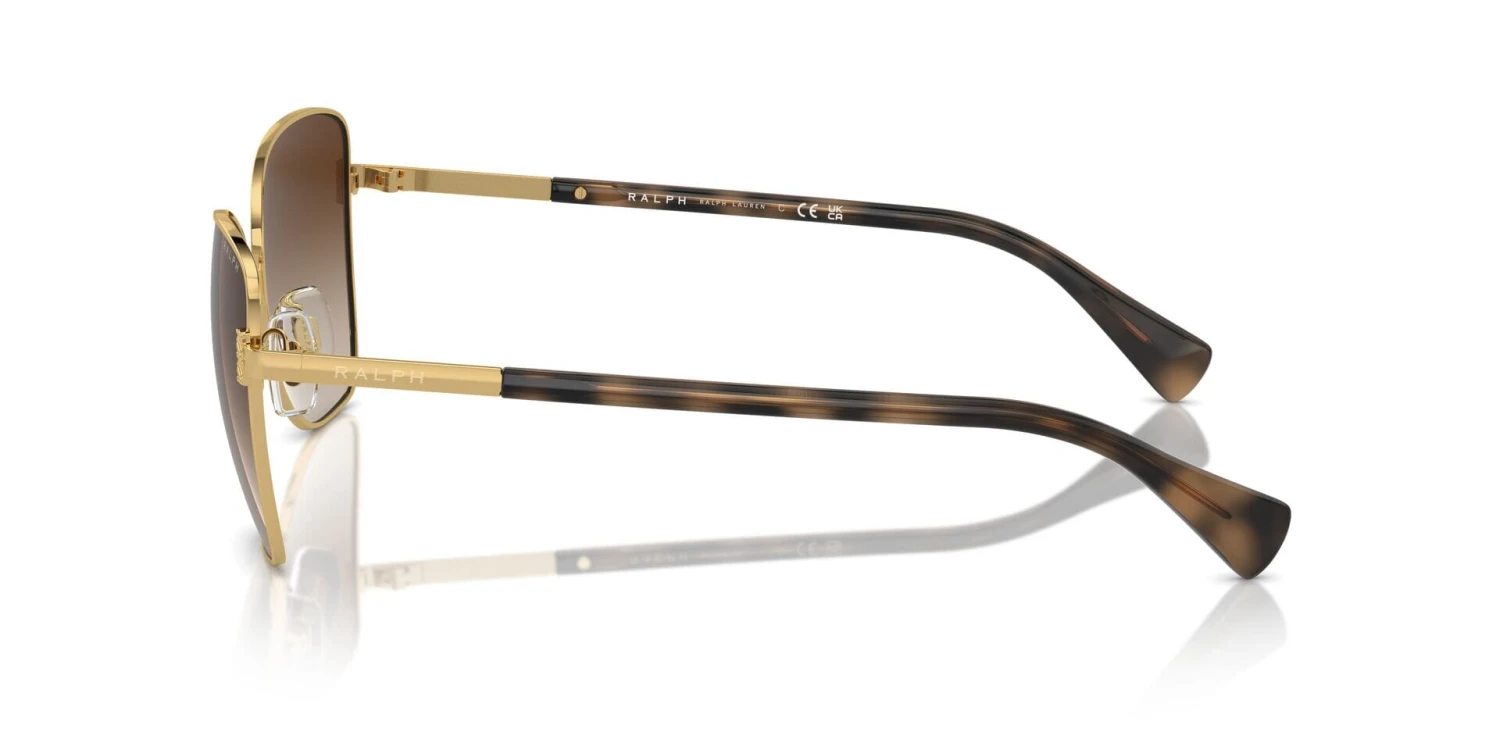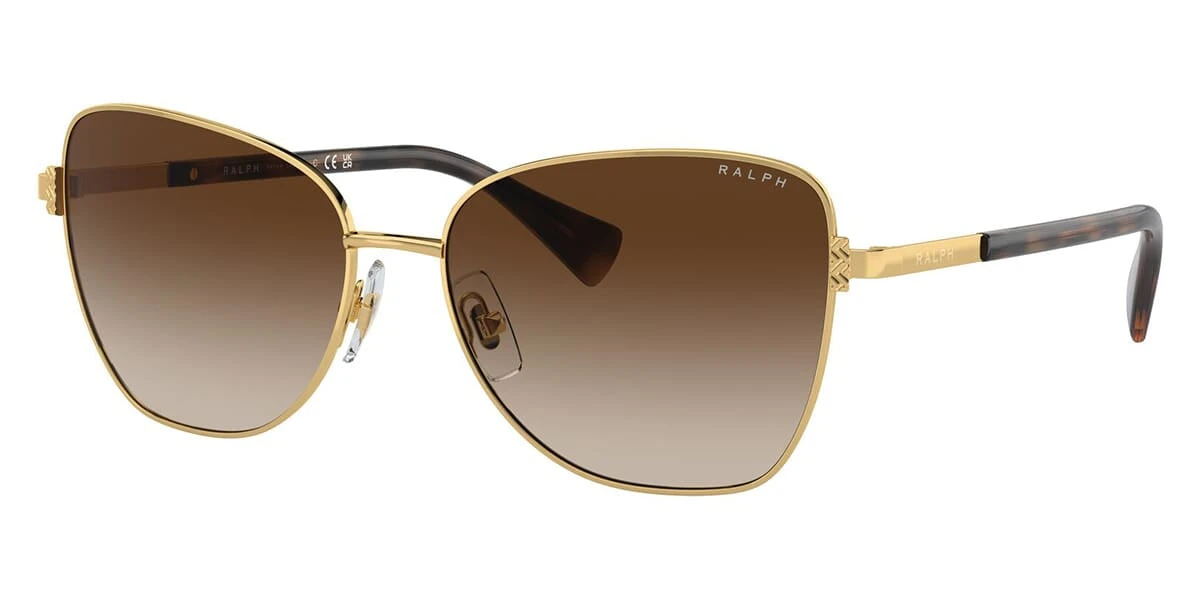 This butterfly Ralph by Ralph Lauren sunglass comes in a shiny gold frame with brown gradient lenses.