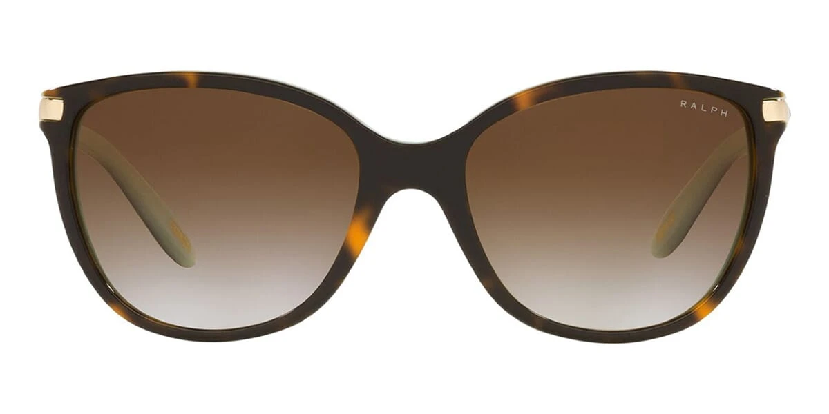 This cat eye Ralph Lauren sunglass comes in a shiny havana on aquamarine frame with brown gradient lenses.