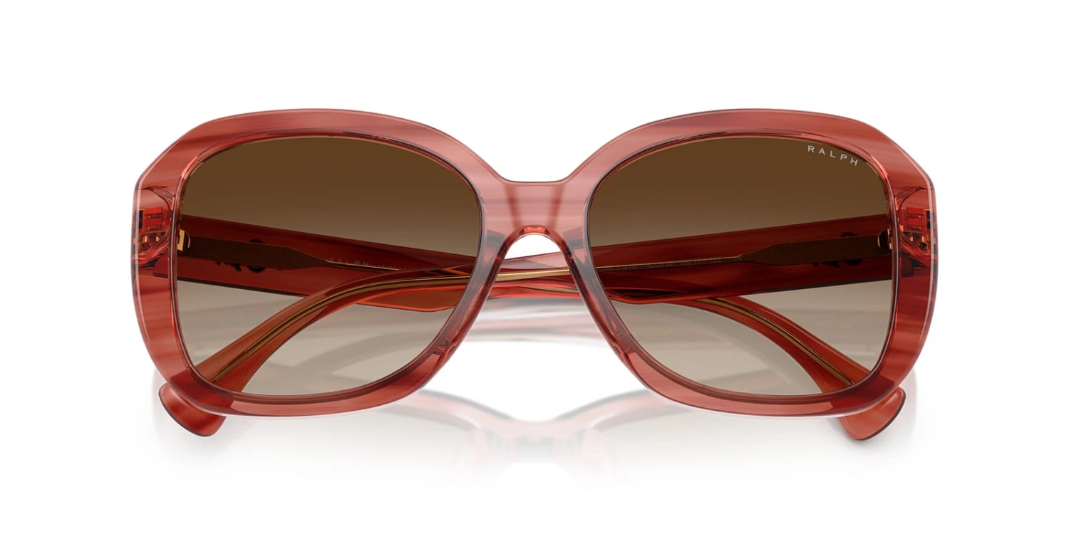 This butterfly Ralph by Ralph Lauren sunglass comes in a shiny milky red demi pink frame with brown gradient lenses.