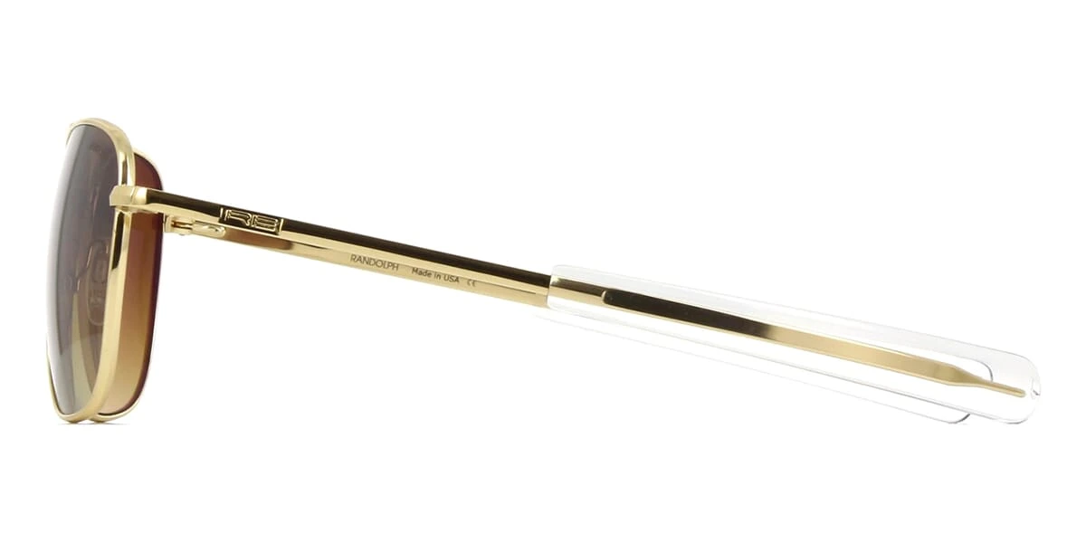 This aviator Randolph sunglass comes in a 23k gold frame with skyforce nylon gradient cape sand lenses.