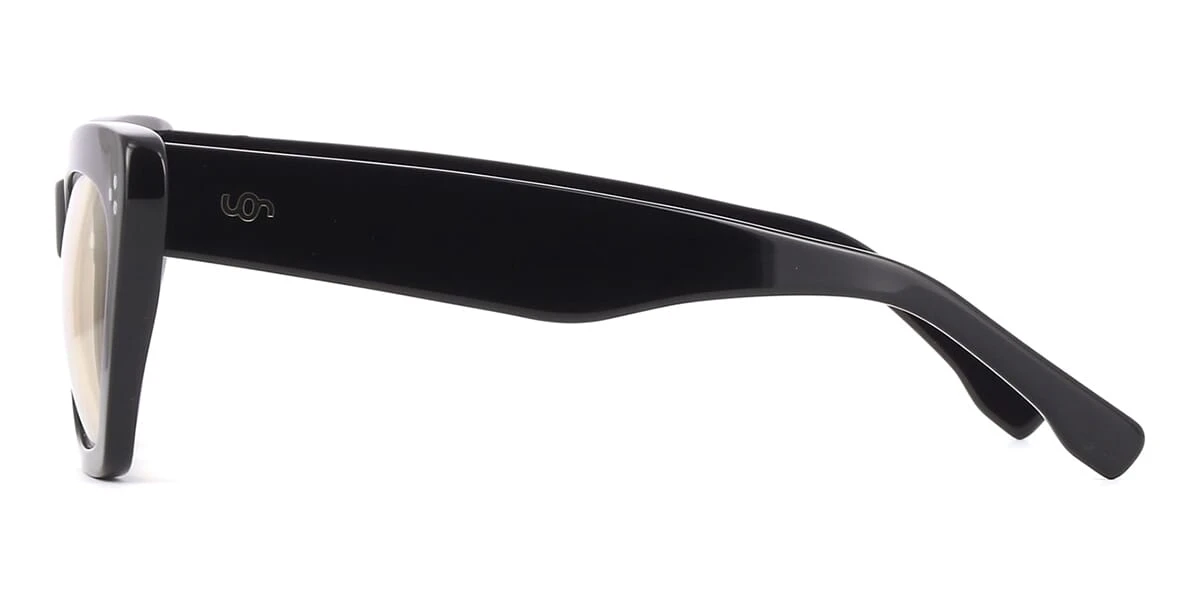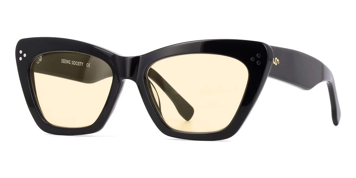 This cat eye Seeing Society sunglass comes in a shiny black frame with light yellow tint lenses.