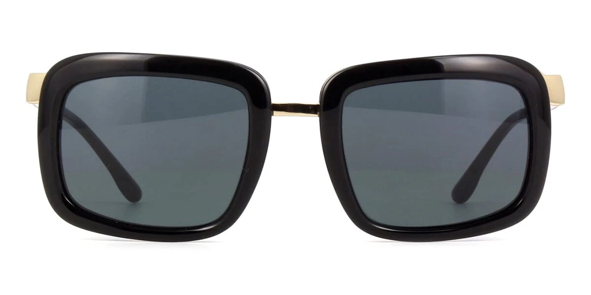 This square Stella McCartney sunglass comes in a shiny black with gold frame with grey lenses.