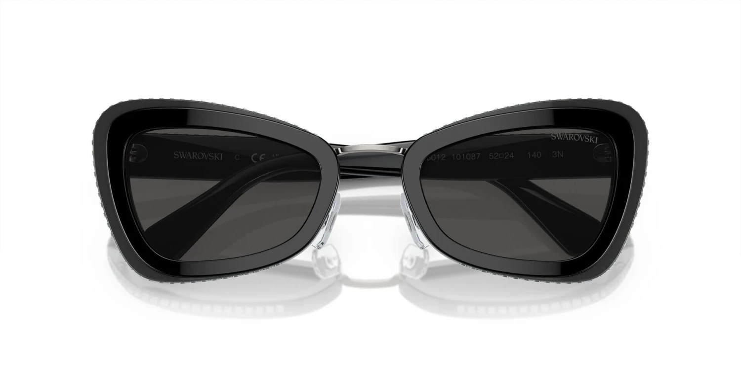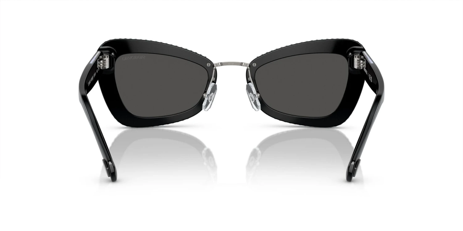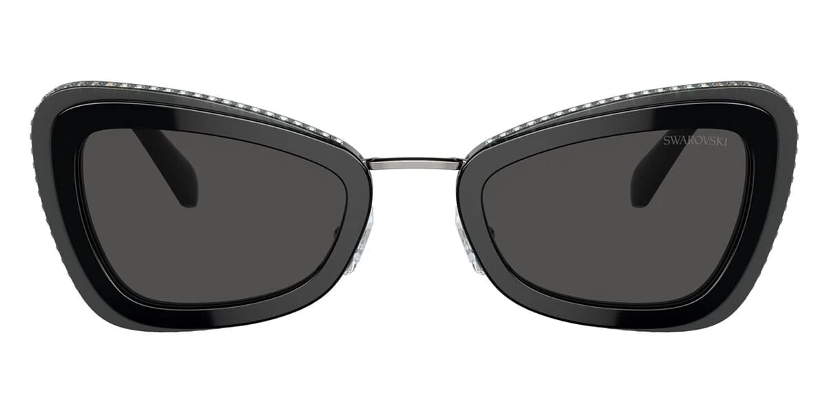 This cat eye Swarovski sunglass comes in a black frame with dark grey lenses.