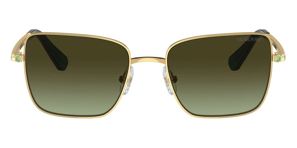 This square Swarovski sunglass comes in a gold frame with green gradient brown lenses.