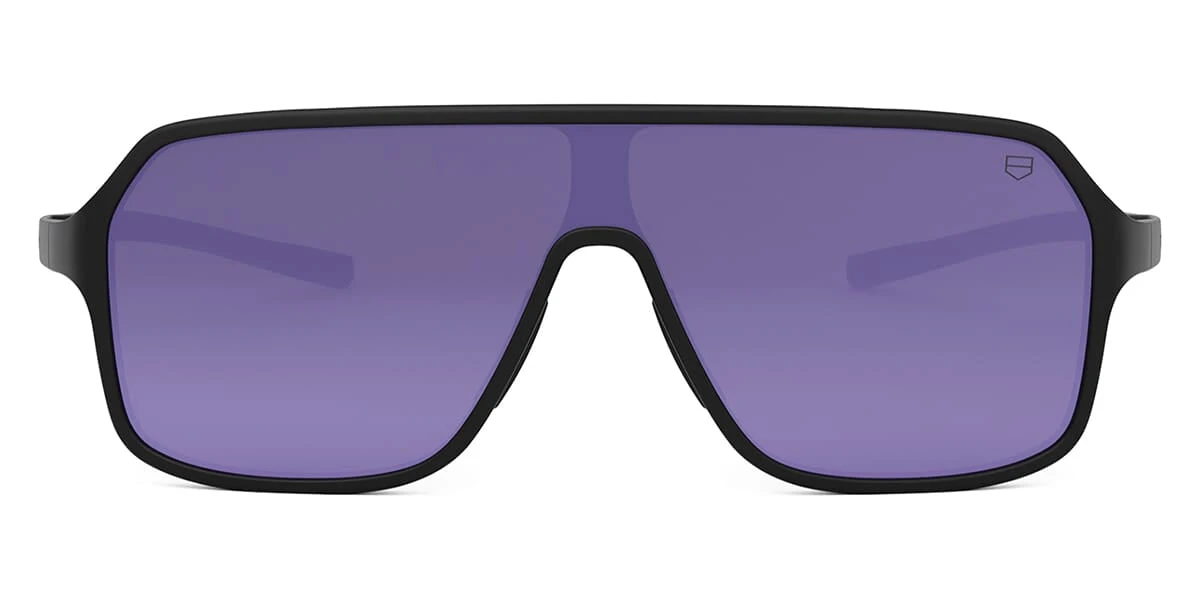 This shield Tag Heuer sunglass comes in a matte black frame with grey with sunset purple mirror lenses.Â