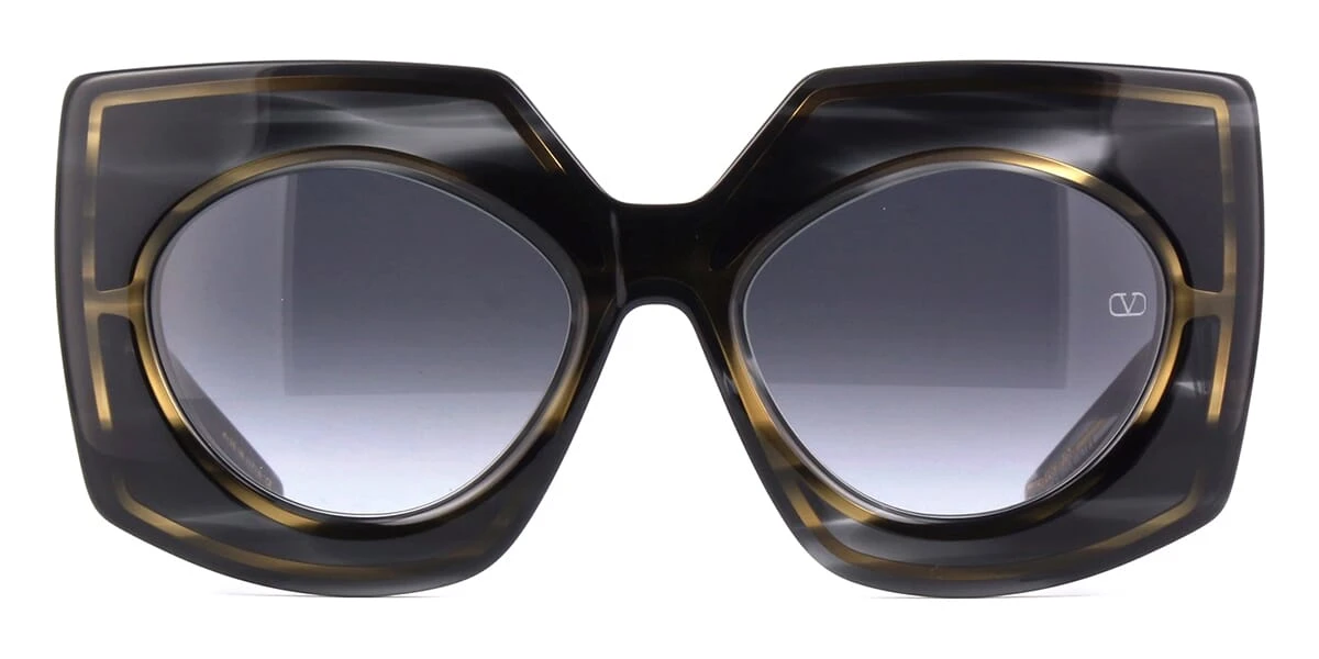 This square Valentino sunglass comes in a black crystal with gold frame with grey gradient with light mirror lenses.