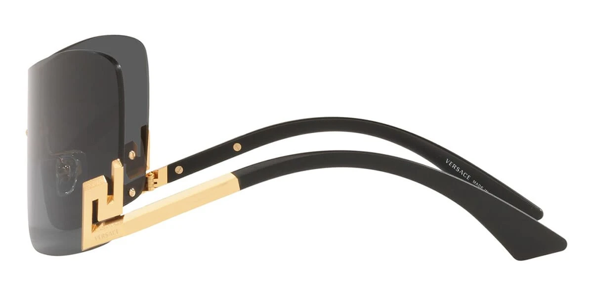 This rectangular Versace sunglass comes in a grey frame with dark grey lenses.
