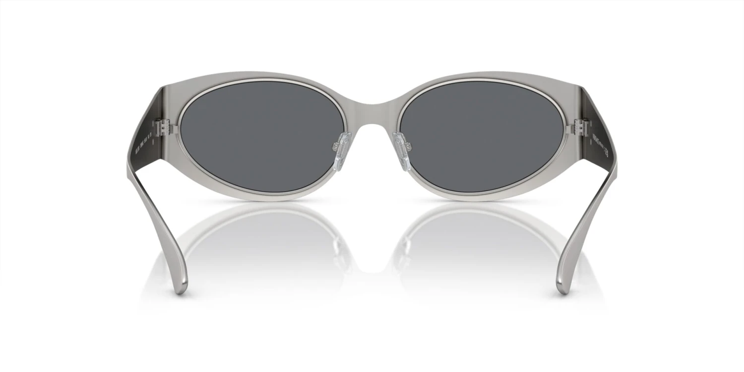 This round Versace sunglass comes in a matte silver frame with light grey with black mirror lenses.