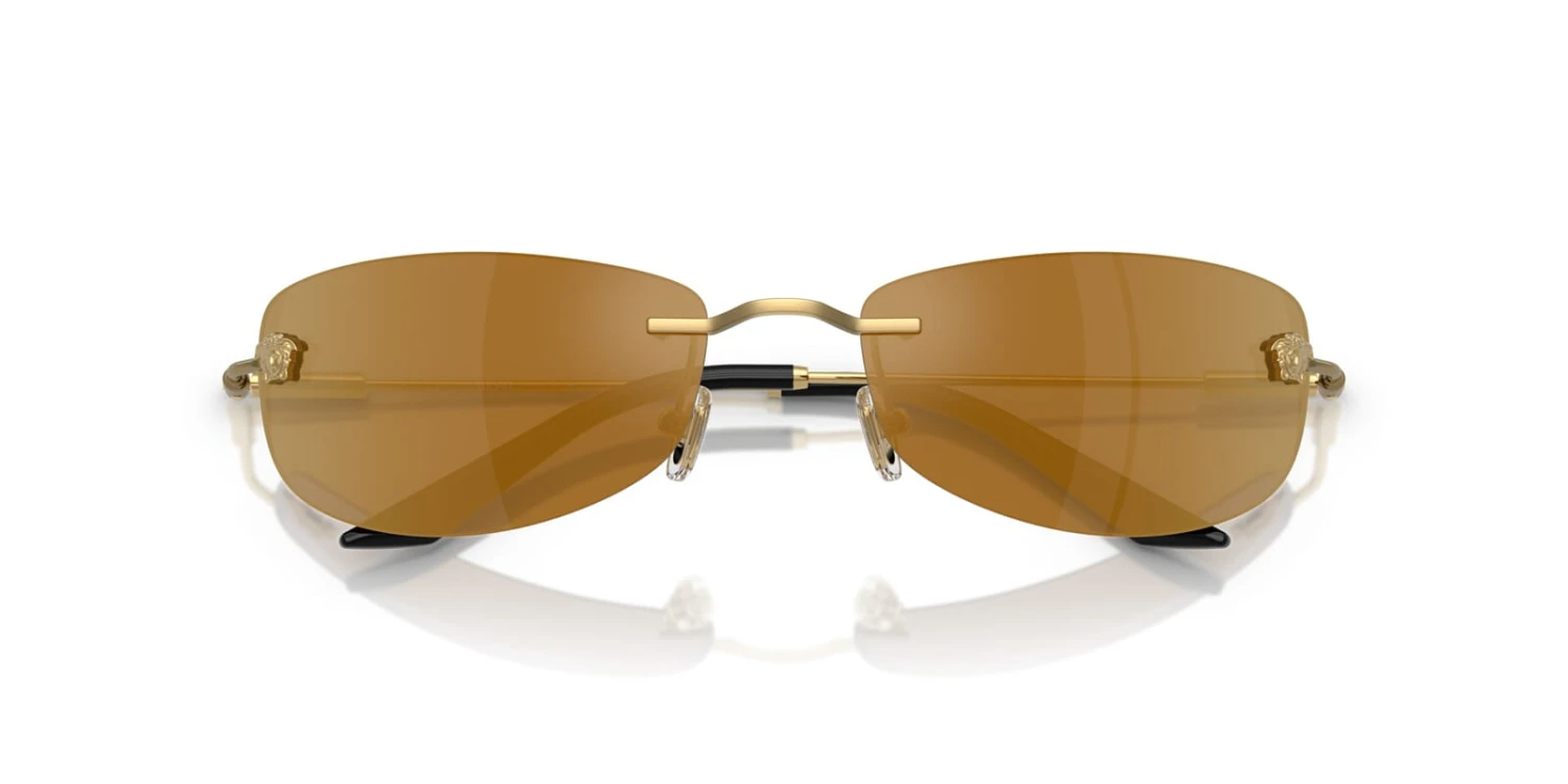 This rectangular Versace sunglass comes in a gold frame with bronze mirror gold lenses.