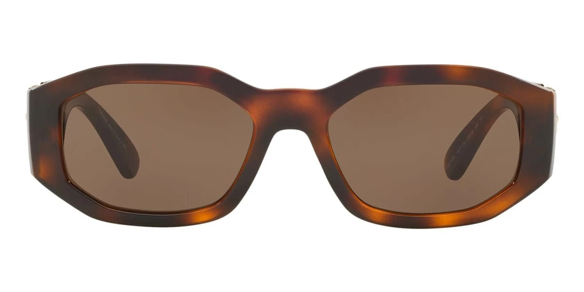This rectangular Versace sunglass comes in a havana frame with dark brown lenses.