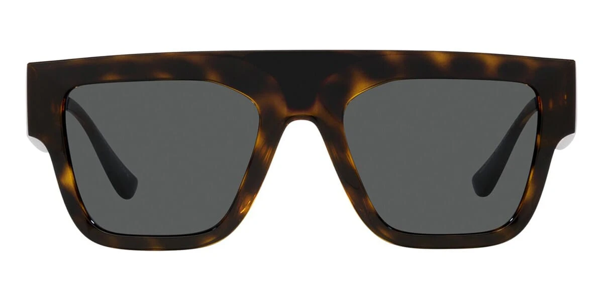 This rectangular Versace sunglass comes in a havana frame with dark grey lenses.