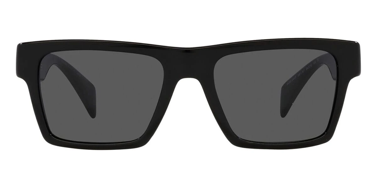 This rectangular Versace sunglass comes in a black frame with dark grey lenses.