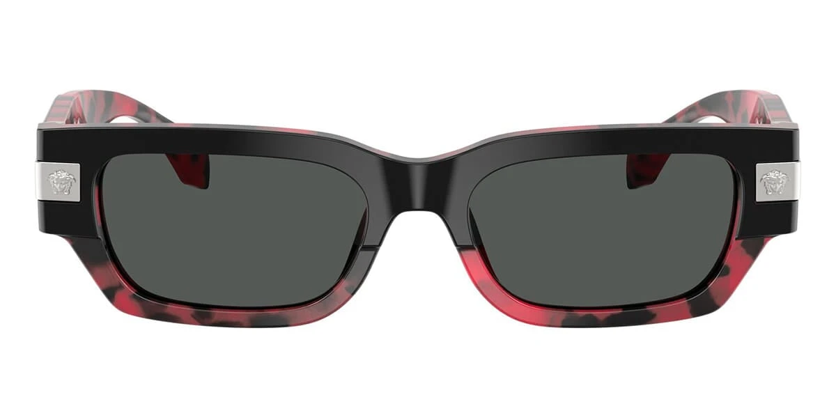 This rectangular Versace sunglass comes in a black on red havana frame with dark grey lenses.