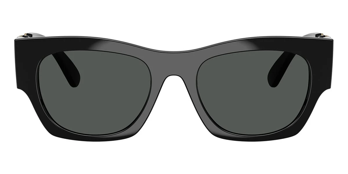 This rectangular Versace sunglass comes in a black frame with dark grey lenses.