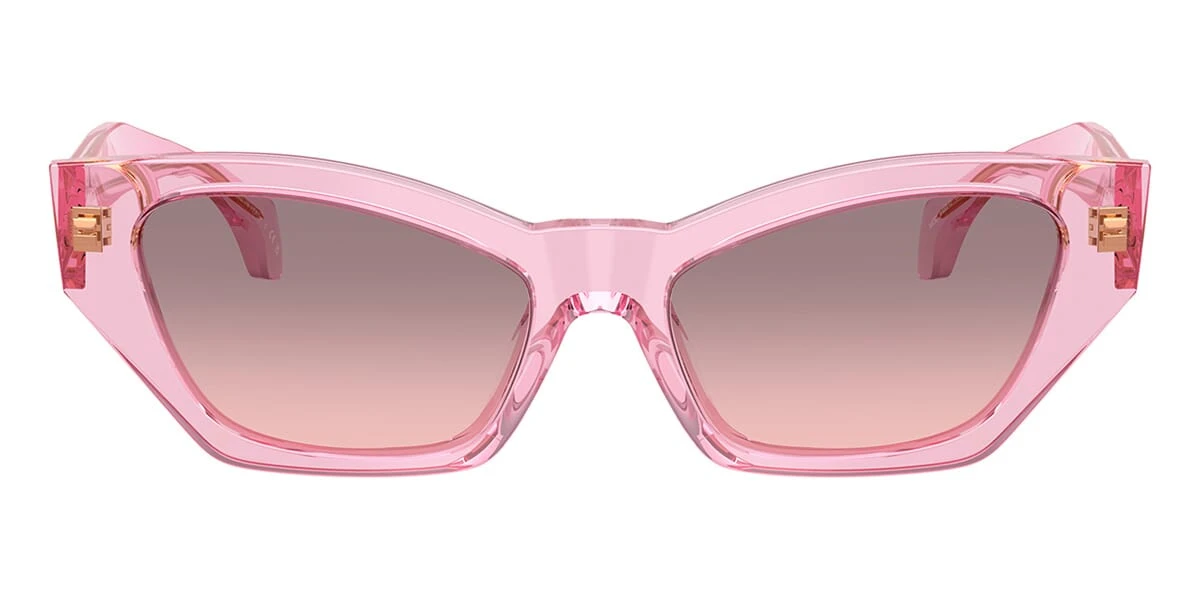 This cat eye Versace sunglass comes in a transparent rose frame with rose grey gradient lenses.