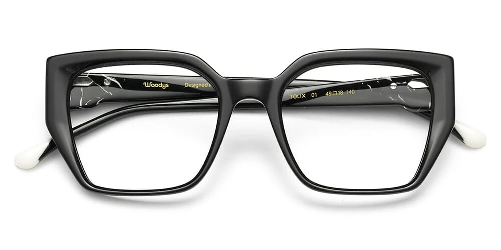 This square Woodys optical comes in a black with white marble effect detail frame.